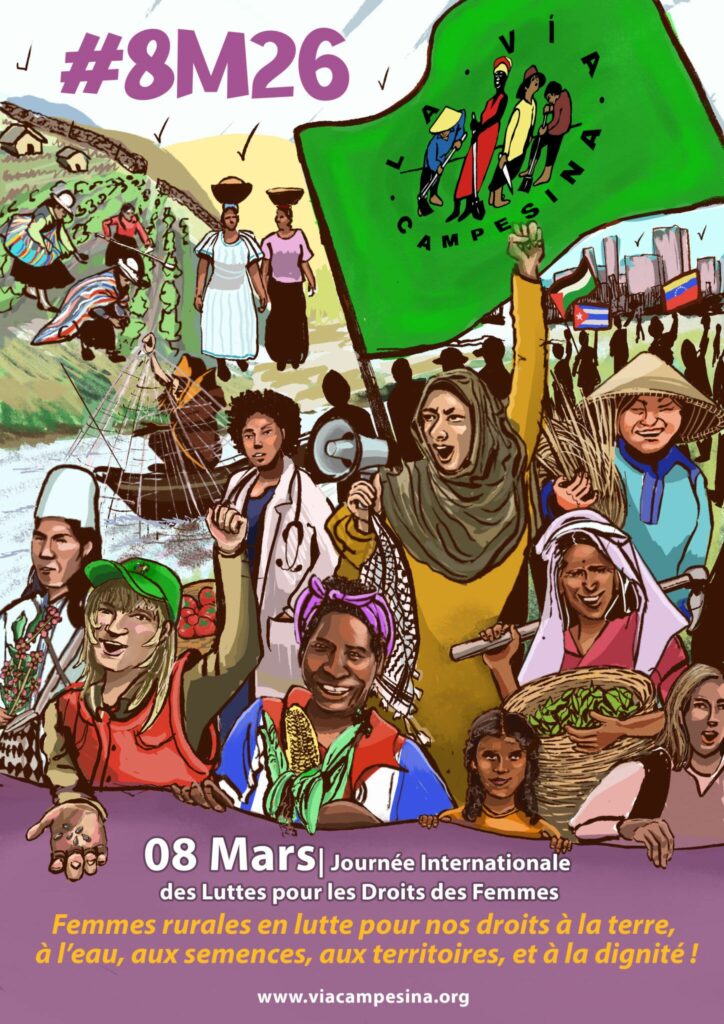 Bagnolet, 18 février 2026) En ce 8 mars, Journée internationale des luttes pour les droits des femmes, en tant que femmes rurales, autochtones, afro-descendantes, pêcheuses artisanales, éleveuses, travailleuses rurales et personnes de genre divers des communautés rurales, nous élevons nos voix depuis tous les territoires du monde contre l’impérialisme, le fascisme, le racisme et les reculs des droits historiques. Nous disons non à la violence structurelle, à la dépossession, aux déplacements forcés et aux féminicides. Nous voulons vivre !