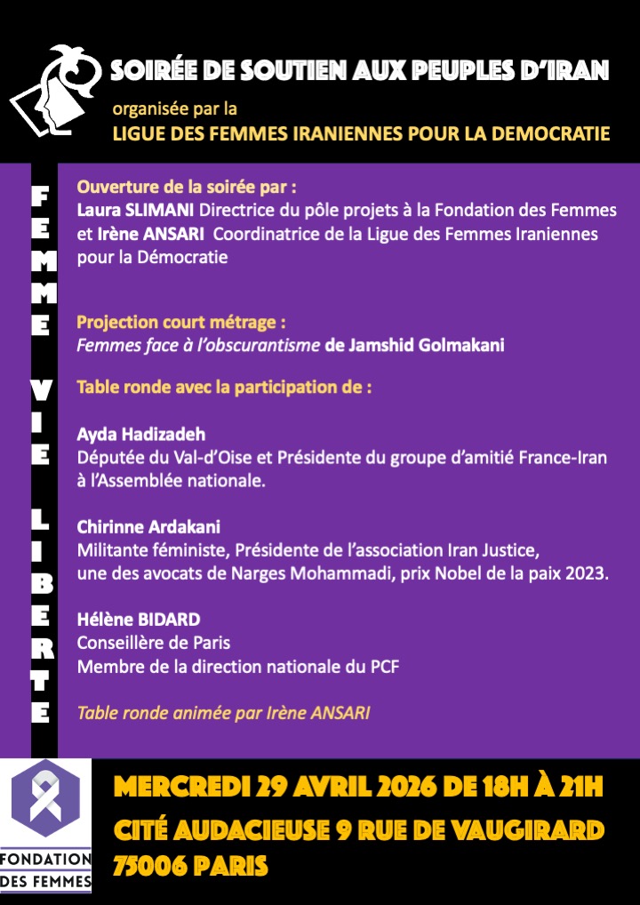 29 avril. Soirée de soutien aux peuples d’Iran organisée par la ligue des femmes iraniennes pour la démocratie 29 avril. Soirée de soutien aux peuples d’Iran organisée par la ligue des femmes iraniennes pour la démocratie 20 avril 2026 administrateur